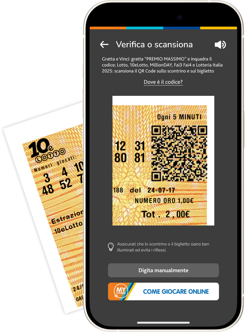 I giocatori hanno la possibilità di verificare se la giocata effettuata al 10eLotto è vincente, attraverso la sezione verifica vincite 10eLotto di app My Lotteries, inquadrando il QR code presente sul lato frontale dello scontrino di gioco. Dopo aver autorizzato l’app ad accedere alla fotocamera del proprio smartphone o tablet, è sufficiente inquadrare il codice, assicurandosi che sia ben illuminato e privo di riflessi.