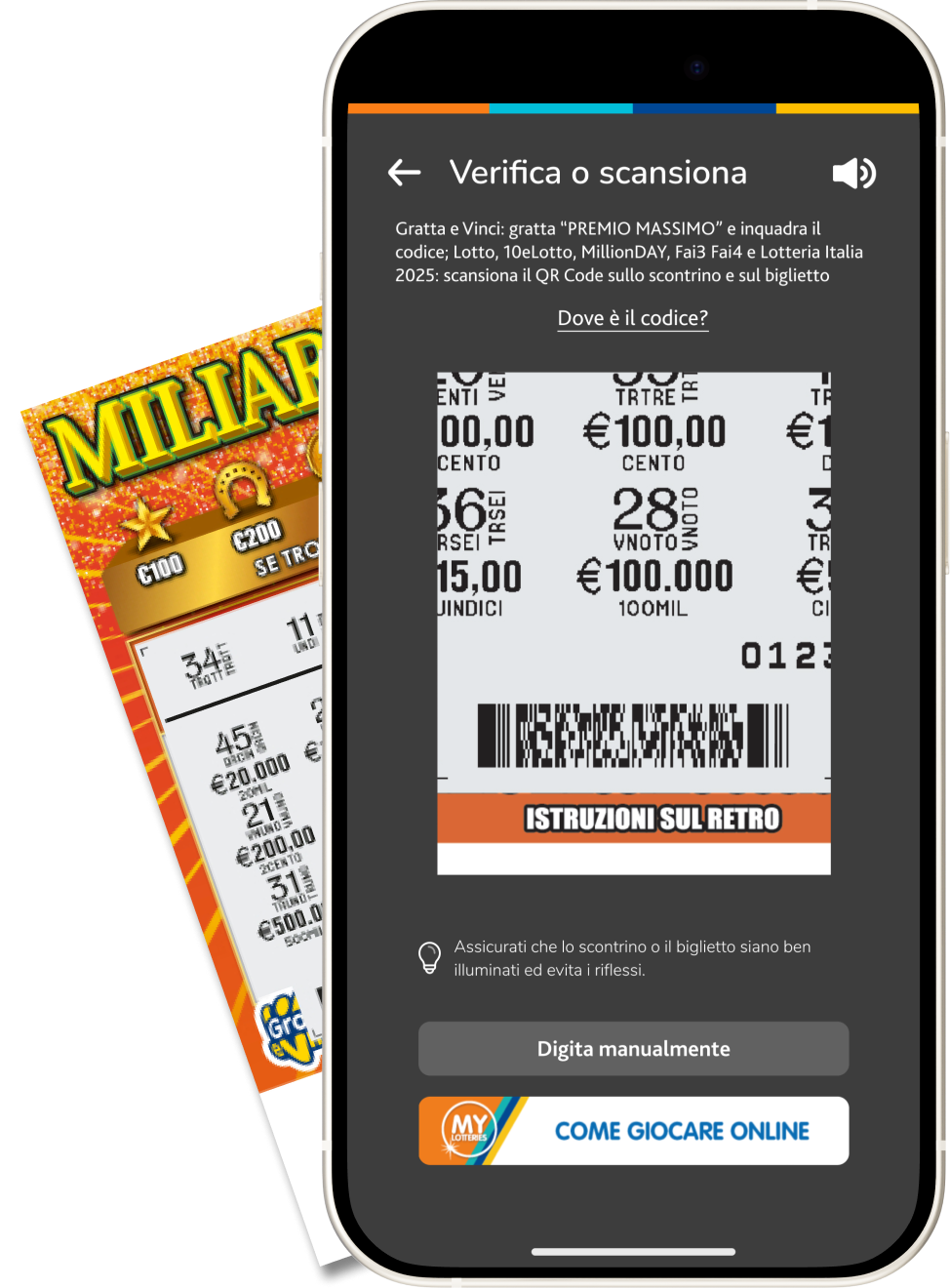 Per verificare se il proprio Gratta e Vinci è vincente attraverso la sezione dedicata di app My Lotteries, è necessario grattare la patina argentata sul lato frontale del biglietto, in corrispondenza della scritta “PREMIO MASSIMO”, e scoprire il codice a barre. Fatto ciò, è sufficiente autorizzare l’accesso alla fotocamera del proprio smartphone o tablet e inquadrare il codice a barre, accertandosi che sia ben visibile. Seguendo questa procedura, i giocatori hanno la possibilità di scoprire immediatamente se il biglietto è vincente.